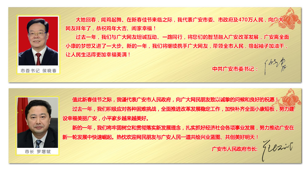 渠江潮涌迎春到,一元复始万象新。值此新春佳节之际,我谨代表中共广安区委、广安区人民政府向全区人民致以新春的祝福!向所有关心支持广安区经济社会发展的各级领导、各界友人表示诚挚的感谢!
