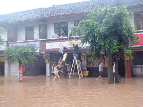 图为园区纪检干部帮助群众转移即将被水淹的库存货物