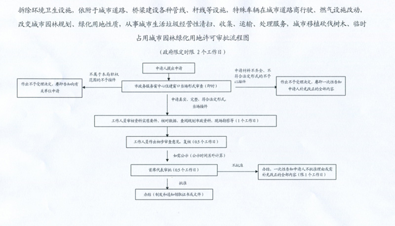拆除环境卫生设施,依附于城市道路、桥梁建设各种管线、杆线等设施,特殊车辆在城市道路商行驶、燃气设施改动,改变城市园林规划、绿化用地性质,从事城市生活垃圾经营性清扫、收集、运输、处理服务,城市移植砍伐树木、临时占用城市园林绿化用地许可审批流程图