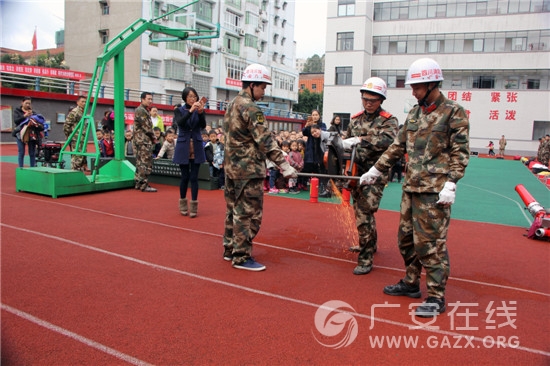 在营区内,消防大队官兵为师生们表演了佩戴空气呼吸器、机动链锯切割木棍、切割机切割钢条、液压钳“咬断”钢条等活动。活动过程中,还专门安排了互动环节,让小朋友们亲身体验了消防、感受了消防,现场气氛十分活跃。