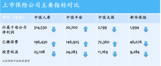 上市保险公司中,除中国平安业绩保持正增长,其他三家保险公司均有不同程度业绩下滑。具体而言,归属母公司净利润这项指标上,只有中国平安同比增长3.7%,其余三家同比大幅下滑45%至57.2%。