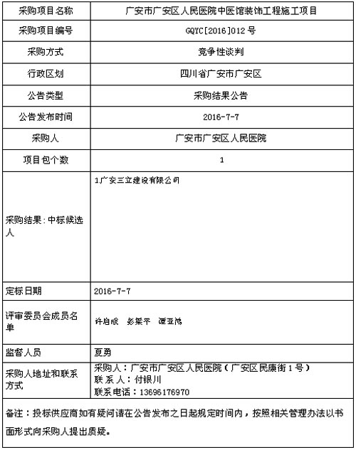 广安市广安区人民医院中医馆装饰工程施工项目招标结果公告