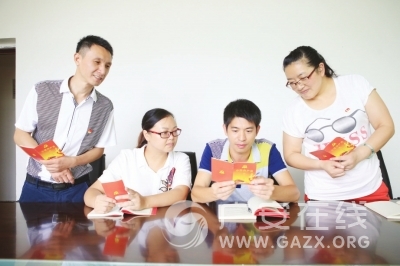 近日,广安区纪委、组织部专门将今年7月8日起正式施行的《中国共产党问责条例》编印成便于携带的“口袋书”,发放到各级各部门党员手中,从而敲响了唤醒责任意识、激发政治担当的“警示钟”。图为近日,杨坪乡机关党员正在通过“口袋书”学习《中国共产党问责条例》,争做党规党纪的坚定执行者和捍卫者。(陈朝建 谭军文 廖小兵 摄)