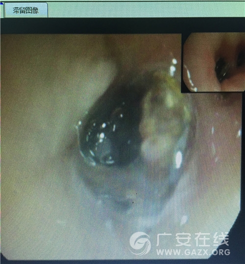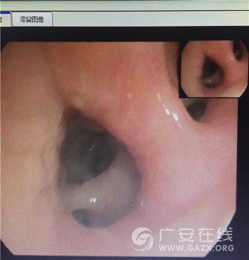 当电子支气管镜的软管探头伸入患者右侧肺下叶时,图像显示出一团灰白色的东西堵在其右肺下叶的基底段,周围布满了泡沫状脓痰。原来,尹某咳嗽、咯脓性痰且病情不断加重,“罪魁祸首”就躲藏在这里“发号施令”的。