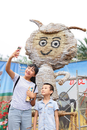 市民在首届“稻草人魔幻艺术节”上与萌萌哒的稻草造型物“唐老鸭”合影。