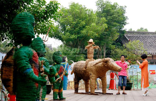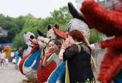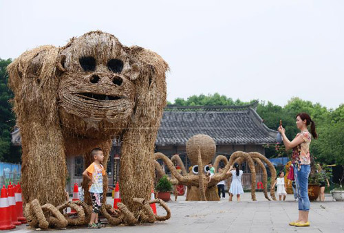 市民在首届“稻草人魔幻艺术节”上拍摄栩栩如生、美仑美奂的稻草造型物。
