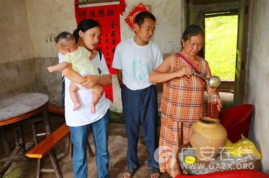 崇望乡合力村第一书记曹小飞怀抱才出生的孩子帮助贫困户销售蜂蜜