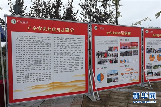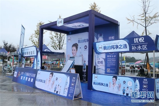15日早上,广安农信·韵动中国2017广安国际红色马拉松赛(以下简称“广安红马”)在广安市邓小平故里景区游客中心鸣枪开赛,国内外近万名选手参赛。图为广安红马冠名赞助商广安农信在赛场周围设置展板展示企业形象,助力广安红马冲击中国田径协会金牌赛事。新华网李想 摄