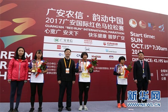 2017年广安红马迷你跑项目学生组女子前三名颁奖仪式。新华网宋溪雨 摄