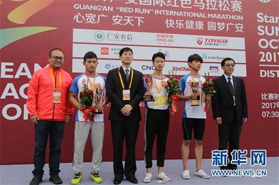 2017年广安红马迷你跑项目学生组男子前三名颁奖仪式。新华网宋溪雨 摄