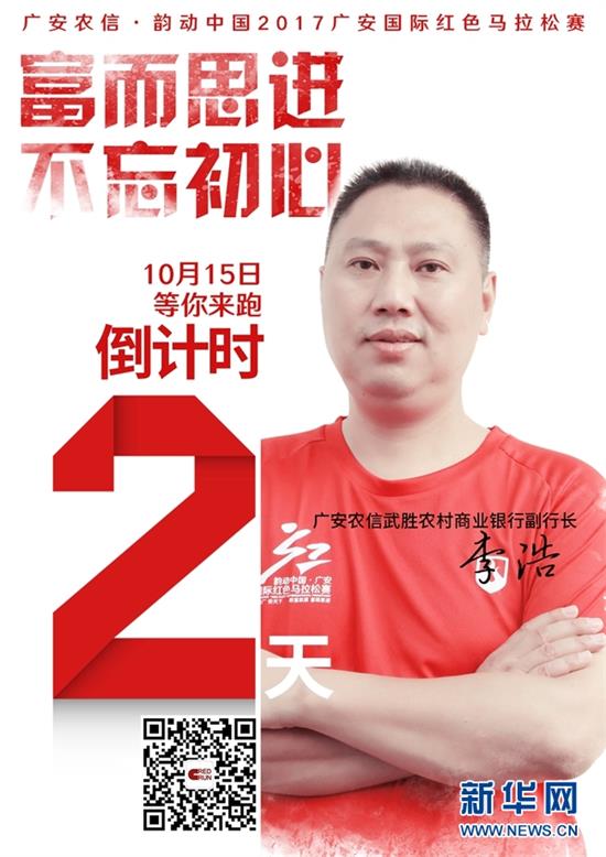 新华网体育广安10月13日电(黄晓芸)在广安农信·韵动中国2017广安国际红色马拉松赛(以下简称广安红马)倒计时2天,赛事组委会发布了一款倒计时海报,海报的文案中写到:富而思进,不忘初心。而海报上的“红马代言人”,是广安农信武胜农商银行副行长李浩。