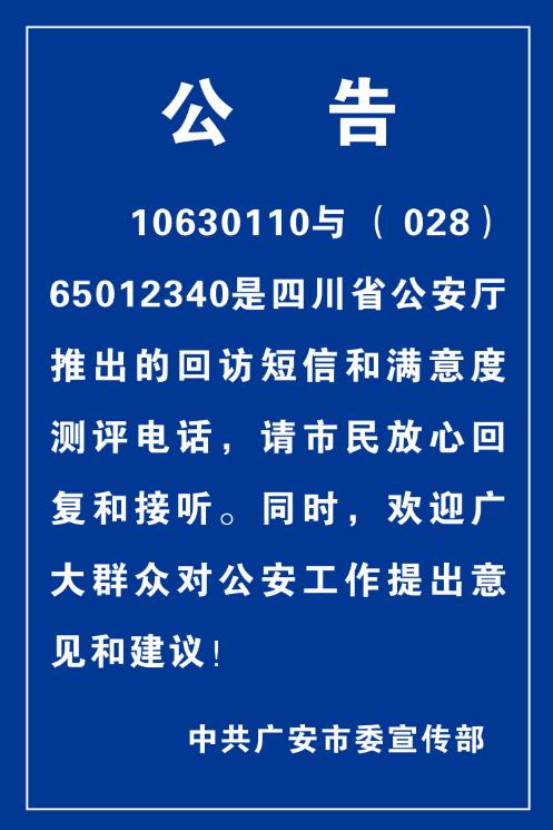 10630110与(028)65012340是四川省公安厅推出的回访短信和满意度测评电话,请市民放心回复和接听。同时,欢迎广大群众对公安工作提出意见和建议!