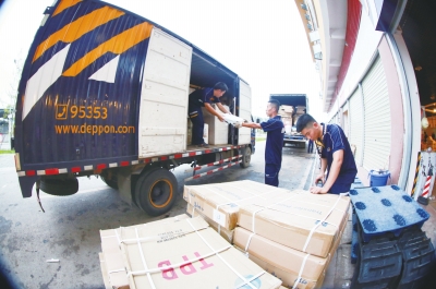 枣山物流商贸园区某物流企业工人正在配送货物。