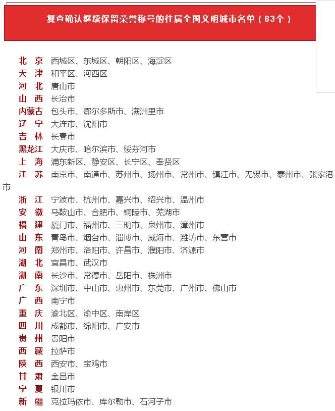 2017年8月以来,中央文明办根据中央文明委2017年版《全国文明城市测评体系》,按照城市自主申报、省级择优推荐、中央部委审核、组织综合测评、听取市民意见、进行综合计分、媒体集中公示等评选程序,严谨规范组织第五届全国文明城市评选工作,以实地暗访考察、入户问卷调查和网上材料审核三种方式对166个参评城市进行测评,严格依据参评城市的2015、2016、2017年三年测评总成绩排名,报中央文明委领导批准,提出第五届全国文明城市名单。同时,中央文明办按照城市进行自查、省级审查推荐、中央部委审核、组织复查测评等复查程序,认真做好往届全国文明城市复查工作,严格依据中央文明办组织的网上材料审核结果和委托各省、自治区、直辖市文明办组织的实地暗访考察、入户问卷调查结果,提出对往届全国文明城市的复查建议,报中央文明委领导批准。现将第五届全国文明城市名单和复查确认继续保留荣誉称号的往届全国文明城市名单公布如下: