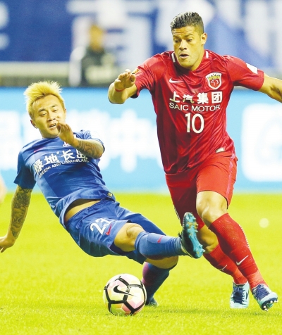 11月19日,上海上港队球员胡尔克(右)在比赛中带球突破。