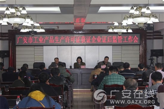 为贯彻落实《国务院关于调整工业产品生产许可证管理目录和试行简化审批程序的决定》(国发〔2017〕34号),深入推进工业产品生产许可证制定改革,多措并举加强事中事后监管,进一步促进部门监管责任和企业主体责任的落实,近日,市质监局组织召开了广安市工业产品生产许可证获证企业证后监管工作会议。市质监局党组成员、副局长李裕出席会议并作了重要讲话,市质监局质量监督科全体人员、各区市县质监部门及市质监局园区分局分管质量的领导、质量股股长、工业产品生产许可证获证企业法定代表人参加了会议。
