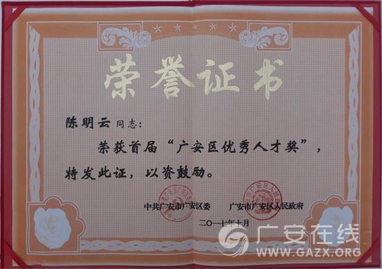 广安区人民医院内一科主任、主任医师陈明云,门诊妇科副主任中医师伍玥也在受表彰的14名优秀人才之列,被广安区委、区政府授予 “广安区优秀人才”荣誉称号。