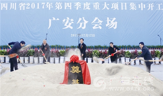 12月12日上午,四川省2017年第四季度重大项目集中开工。广安作为全省集中开工仪式的分会场之一,在枣山物流商贸园区“广安铁路枢纽物流孵化园项目”现场与省上同步举行集中开工仪式。市委书记侯晓春出席开工仪式,并宣布项目开工。市委副书记、市长曾卿出席开工仪式并讲话。市人大常委会主任余仪,市政协主席肖雷等出席开工仪式,市委副书记严春风主持开工仪式。