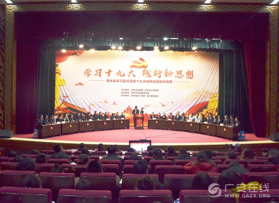 12月29日,在邻水县宣传文化中心剧场举行 “学习十九大、践行新思想”主题知识竞赛活动。通过此次活动,进一步推进各级党组织和广大党员干部深刻领会党的十九大精神实质,激发各级党员干部“学精神、思党恩、谋发展”的工作热情,掀起全县学习宣传贯彻党的十九大精神热潮。(刘伟)