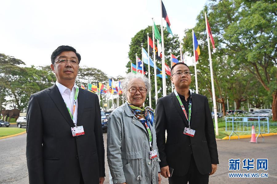 这是12月5日在肯尼亚内罗毕联合国环境规划署总部拍摄的塞罕坝林场老中青三代陈彦娴(中)、刘海莹(左)、于士涛的合影。三代造林人半个多世纪的持续奋斗,让贫瘠沙地变成绿水青山,也获得世界赞誉。5日,联合国环境规划署宣布,中国塞罕坝林场建设者获得2017年联合国环保最高荣誉——“地球卫士奖”。新华社记者陈诚摄