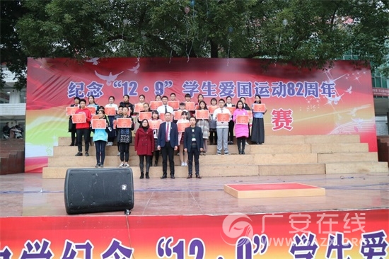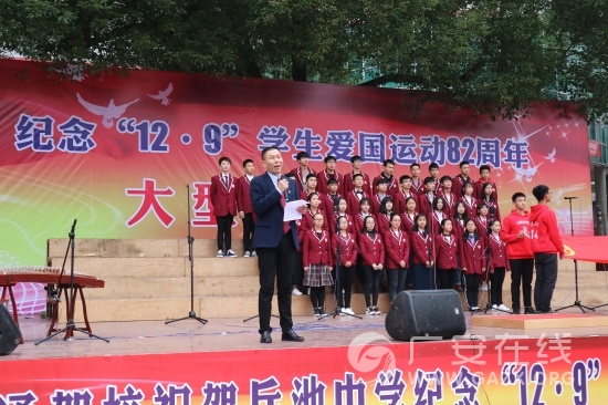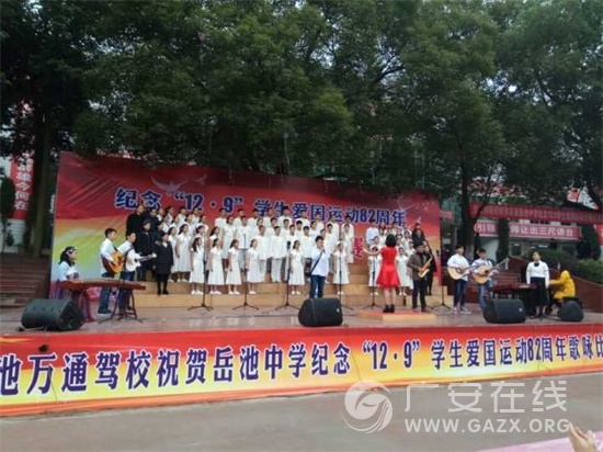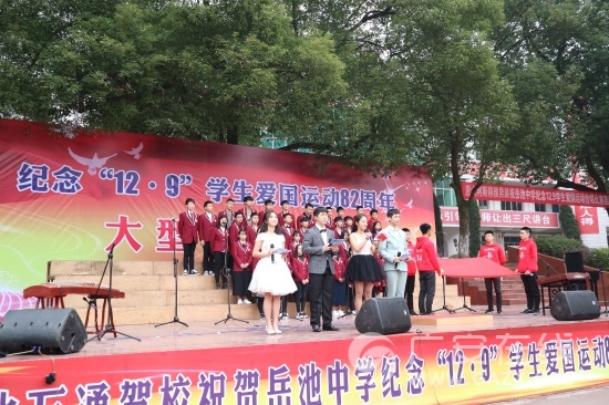 为纪念12·9学生爱国运动82周年,铭记历史、缅怀先烈,积极宣传贯彻十九大精神,让十九大精神“进校园、进班级、进课堂”,进一步坚定广大青年学生“永远跟党走”的理想信念,展现岳中师生奋发向上的精神风貌。12月6日,岳池中学在老运动场隆重举行了以“弘扬爱国情怀、挥洒青春风采”为主题的纪念12·9学生爱国运动82周年大型歌咏比赛,共青团岳池县委、县教科体局及九龙城区督导责任区的领导和岳池中学6000余名师生共同观看了比赛。