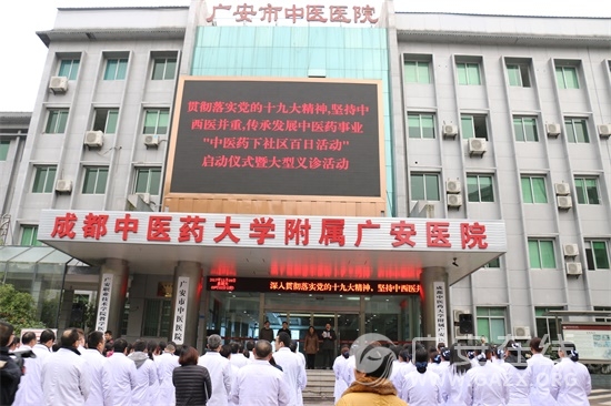 为贯彻落实十九大精神,坚持中西医并重,传承发展中医药事业,造福广安人民,12月9日,“中医药下社区百日活动”启动仪式在广安市中医医院举行。活动当日,来自成都中医药大学专家、中国农工民主党和九三学社的名医专家们在广安市中医医院门诊大楼前为广安市民举行了义诊活动。
