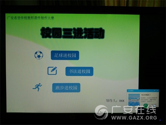 多媒体课件在现代教育教学过程中具有举足轻重的地位,它能增强课堂教学的直观性、形象性和生动性。12月8日,广安希贤学校举行了“校园三进”教师课件制作大赛。