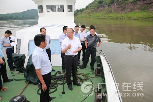 图为文书记一行在乘船巡视渠江广安区境内的北辰段、大龙段、苏溪段和石笋段
