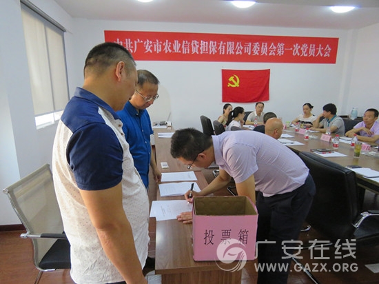 全体党员通过了选举办法,大会采取无记名方式,选举蒋德澍、冉启平、蒲建平、田敏四名同志为中共广安市农业信贷担保有限公司委员会第一届党委委员,蒲建平、唐镱匀、廖春梅三名同志为第一届纪委委员。同时召开第一届党委第一次全体会议,选举蒋德澍同志为党委书记。召开第一届纪委第一次全体会议,选举蒲建平同志为纪委书记。蒋书记和蒲书记分别作了当选讲话。