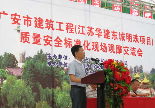 7月18日上午,我市建筑工程质量安全标准化施工现场观摩会在岳池县城东新区“东城明珠”项目工地召开。市住房和城乡建设局总工程师刘运举、岳池县副县长杨伟,项目施工方江苏华建负责人程杰出席会议并讲话。