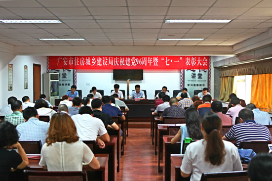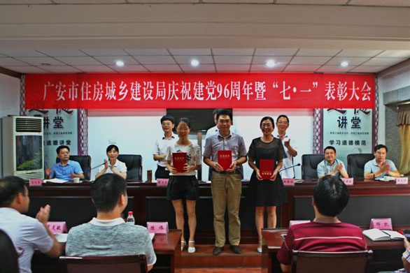为了隆重纪念中国共产党成立96周年,表彰先进、弘扬正气、激励全体党员不忘初心、坚定理想信念,充分发挥先进典型的示范引领作用。 2017年6月30日下午,市住房城乡建设局在3楼会议室召开庆祝建党96周年暨“七•一”表彰大会。党组成员、副局长钟爱平(主持行政工作)出席会议并讲话,在家班子成员、机关党委所属全体党员90余人参加会议。
