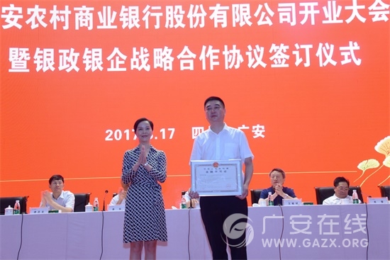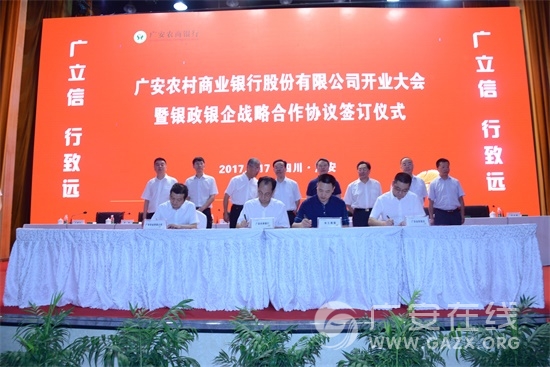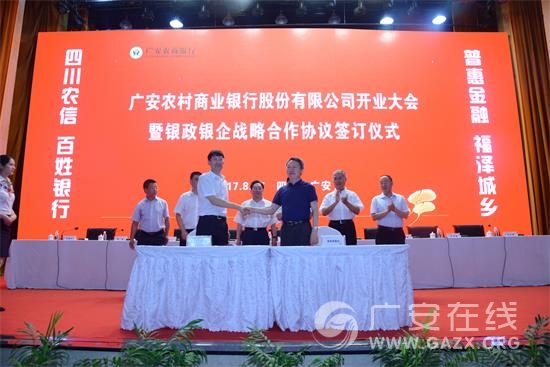 8月17日上午,广安农村商业银行股份有限公司开业暨银政银企战略合作签约仪式举行。市委书记侯晓春,省信用联社党委副书记、主任艾毓斌出席活动并讲话。市人大常委会主任余仪,市政协主席肖雷等出席活动。