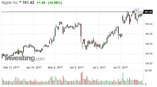 这一消息推动苹果股价周一开盘涨超1%,交投于161.50美元。若涨势延续,有望突破8月15日所创收盘纪录新高161.60美元,今年以来累涨39.4%。