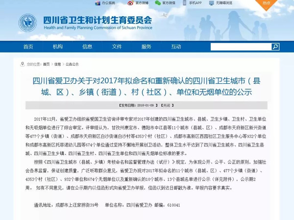 记者从四川省卫生和计划生育委员会网站获悉,日前,省爱卫办对2017年拟命名和重新确认的四川省卫生城市(县城、区)、乡镇(街道)、村(社区)、单位和无烟单位进行公示,公示期2周。