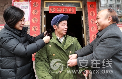 1月12日, 四川省华蓥市委报道组参与脱贫攻坚工作的帮扶责任人,冒着寒风在观音溪镇高坪村四组回访被帮扶对象易相海老人(中),并为寒冬中的老人试穿刚送上的御寒棉大衣。