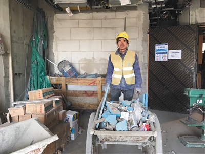 葛远征在工地运送垃圾。记者 罗芊 摄