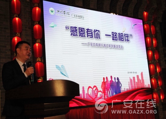 为感谢广大客户及社会各界多年来对广安农信社工作的关心和支持,增进与客户之间的相互沟通、理解,1月18日下午,广安农村商业银行举办了以“感恩有你、一路相伴”为主题的新年客户联谊茶会。广安农商银行党委书记、董事长王德平等领导、市级相关部门负责人与来自全市企事业单位的80余位客户代表共话合作、共谋发展、共品人生。