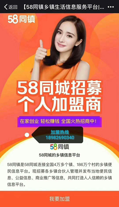 58同镇是58同城集团旗下往农村延伸的项目,是建立在乡镇市场的一个连接全国 4 万多个镇的便民信息平台。 58同镇是集便民信息、营销推广、公益传播、政府公告、就业招聘等于一体的信息平台。用户可以通过管理员发布各类的便民信息,利用平台的影响力解决日常人们生活中遇到的困难,同时用户也可以在 58 同镇平台里检索每天的便民、利民、惠民信息,查阅自己关心的信息,以达到资源共享、信息共享。58 同镇是要打造一个人人信赖的乡镇信息平台! 58 同镇连接于城市服务于农村,促乡镇就业、助精准扶贫、推信息化建设,打破农村信息闭塞,为发力智慧家村生活服务打造(三农)融合范本! 58同镇是一体化的大数据信息平台,58同城上市集团项目,系统化培训,操作简单,个人可加盟,低投资、持续收益,让你月收入过万不再是梦,还可利用平台轻松嫁接自身项目,让你的业务量猛增!抢到绝对赚到!