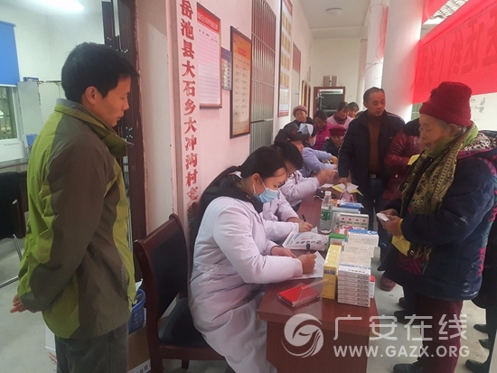 2017年12月29日上午,岳池县经开区协调中医医院到联系帮扶的贫困村,大石乡大冲沟村开展医疗扶贫下乡义诊活动,为村民送医送药送健康,解决群众看病难问题。