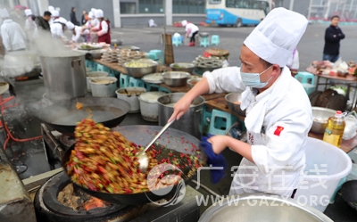 2018年1月20日,四川省华蓥市的乡村大厨在工业新城中鼎创集团,熟练地烹制宴请即将返乡与亲人团年的农民工的“坝坝宴”食物。
