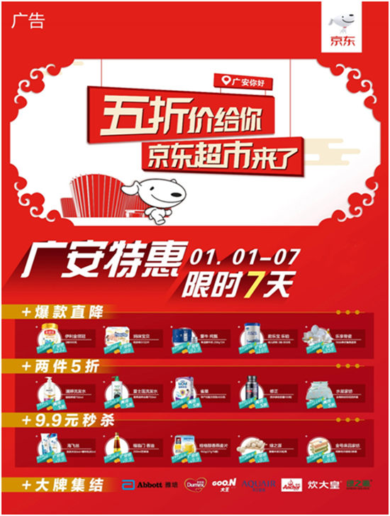 为向三四线城市的消费者提供更多优质的产品和服务,带动品质消费升级。京东超市加快在全国三四线城市的布局,大力推行“京东超市百城行”活动,1月1日-1月7日,京东超市在广安开展专享促销活动,掀起购物热潮,只要收货地址在广安的朋友,在京东超市购物可享受2件5折、满减直降、9.9元秒杀等优惠。