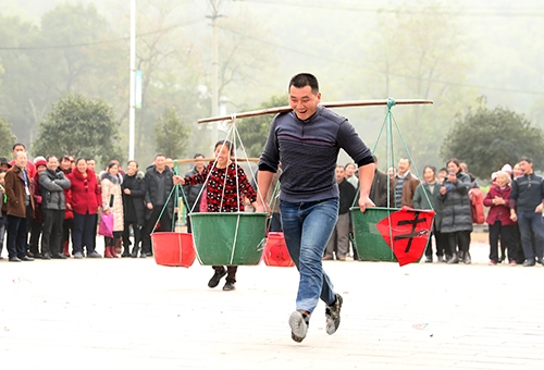 图为华蓥市溪口镇与重庆市合川区三汇镇的农民, 在“共建省际边界、振兴乡村”趣味运动会上参加挑担子比赛。(邱海鹰 文/图)