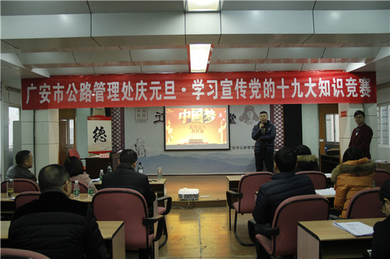2018年12月29日,广安市公路管理处主办了“庆元旦·学习宣传党的十九大知识竞赛”活动,直属养护段积极参与了十九大知识竞赛和个人独唱分项活动,展示了公路养护职工昂扬向上的精神风貌。