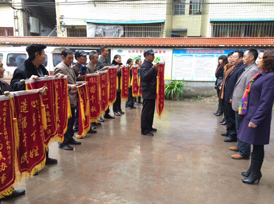 12月2日上午,天下着蒙蒙细雨,敲着鼓,吹着号,新学乡石栏村村民代表10余人冒雨将12面锦旗送到乡政府,表示全体村民对惠民工程的谢意。